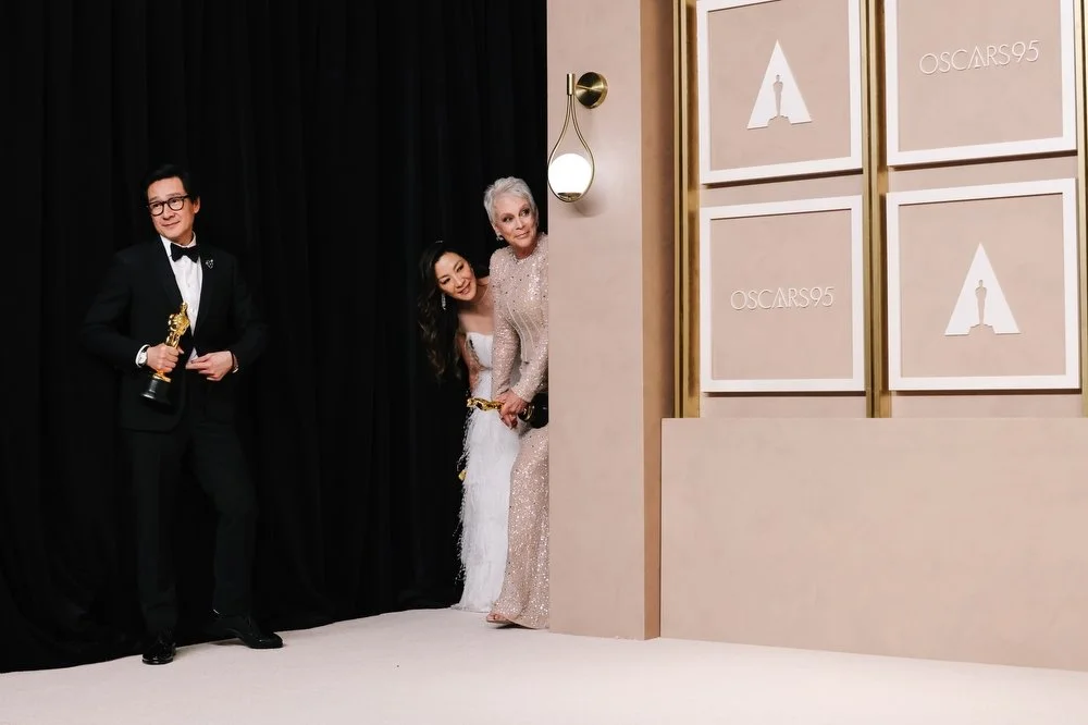 Actors Ke Huy Quan, Michelle Yeoh and Jamie Lee Curtis celebrate their oscars during the 95th annual Academy Awards at Dolby Theater on March 12, 2023.